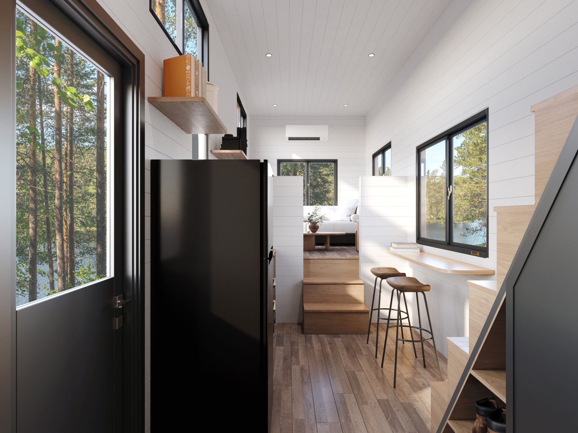 Inside, the thoughtful design continues with Black Painted Birch Cabinets and Butcher Block Countertops, complemented by White MDF walls with trim and easy-to-maintain vinyl flooring. The raised floor living room offers ample storage with cabinet doors, while a Bosch Ductless Mini Split provides efficient heating and cooling for year-round comfort.