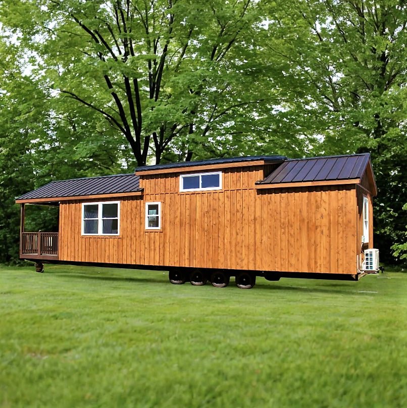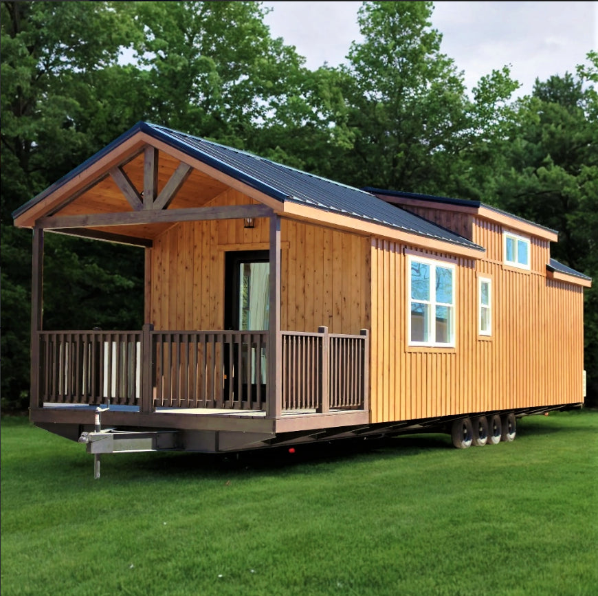 Introducing The Teddy Bear Park Model Tiny Home, a spacious and charming retreat on wheels. This beautifully designed home features Cedar Board & Batten Siding and a stylish Black Metal Roof, blending durability with rustic elegance. With just under 400 square feet of carefully planned living space, including a welcoming 8-foot porch with railings, it’s the perfect spot to enjoy morning coffee or a relaxing evening.