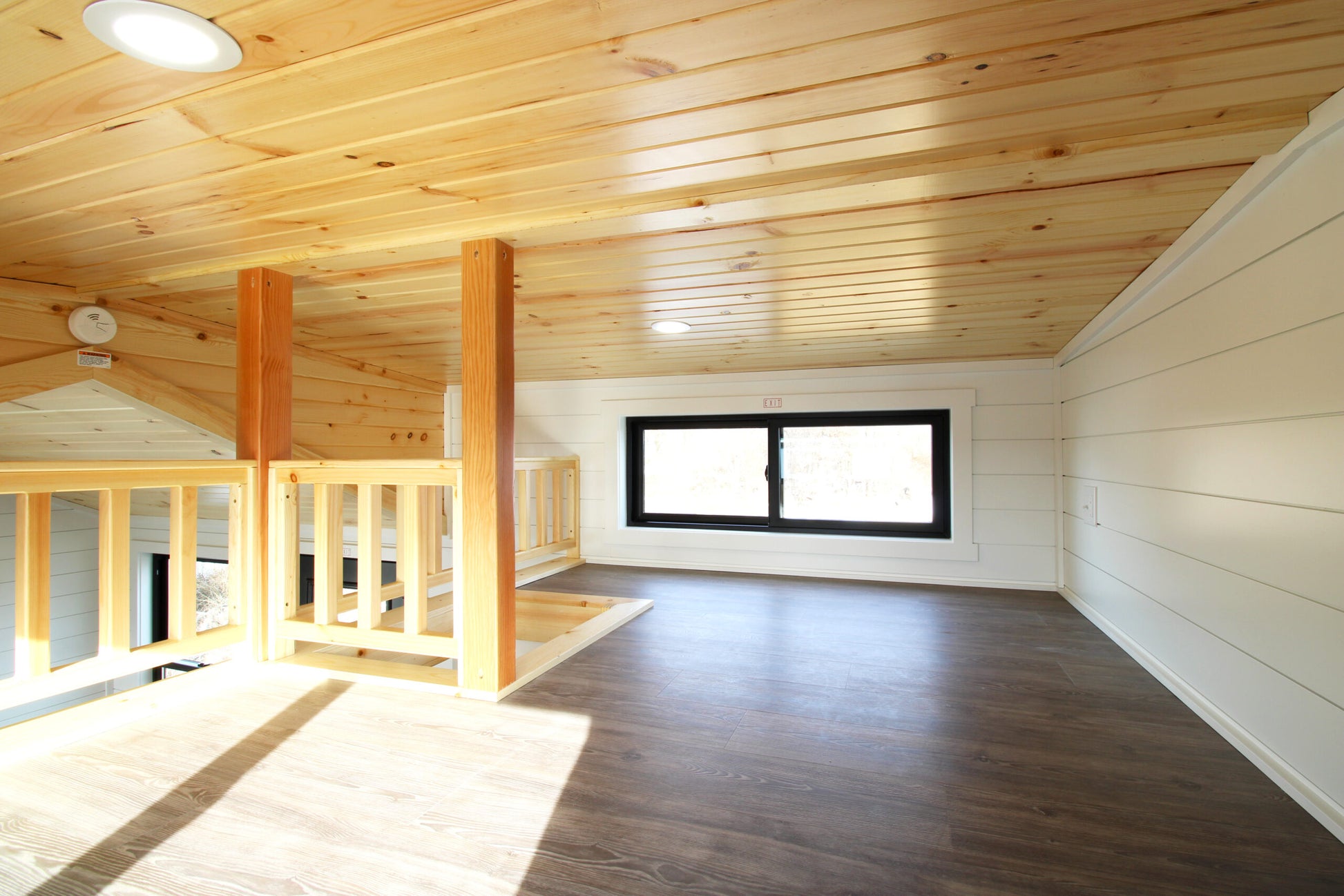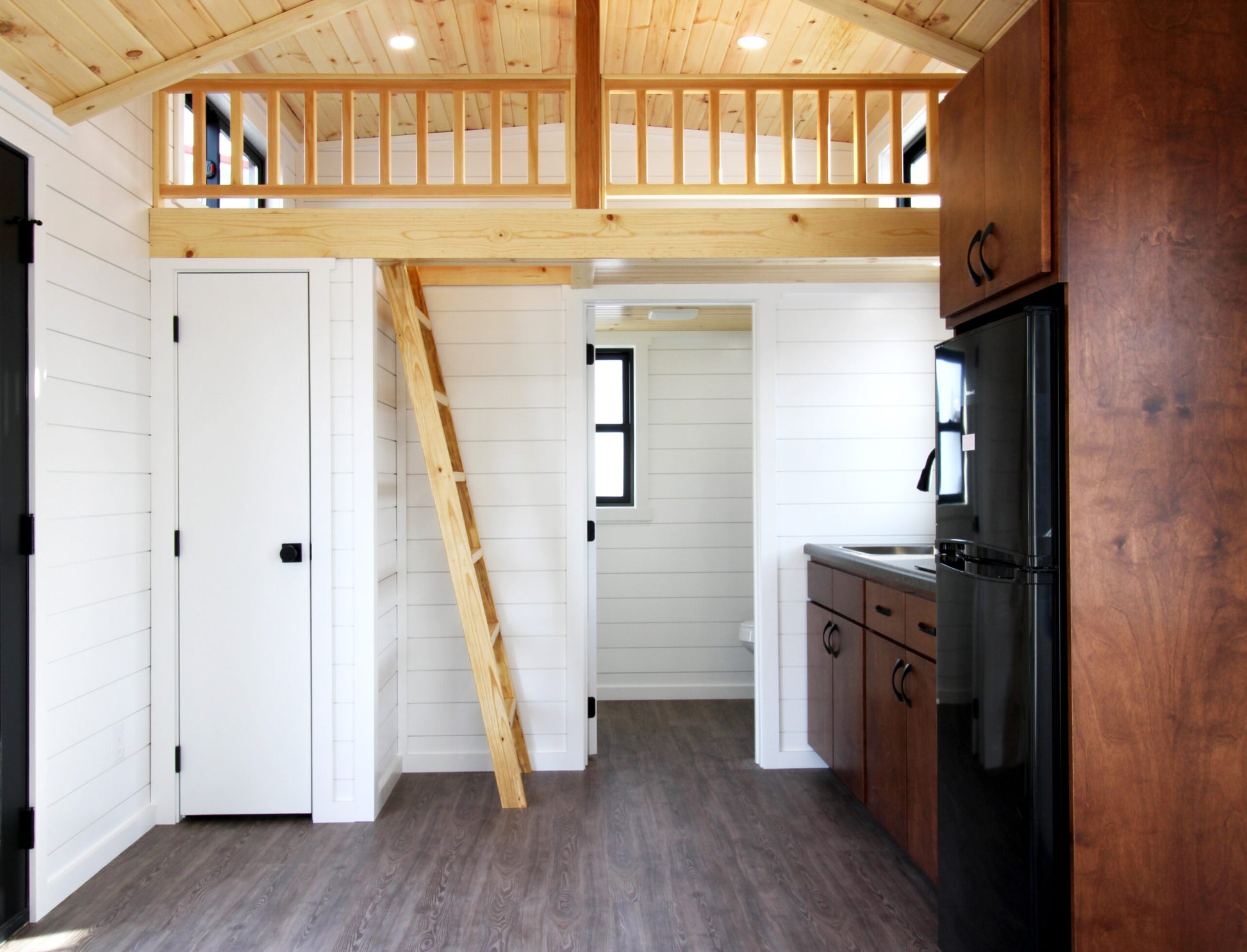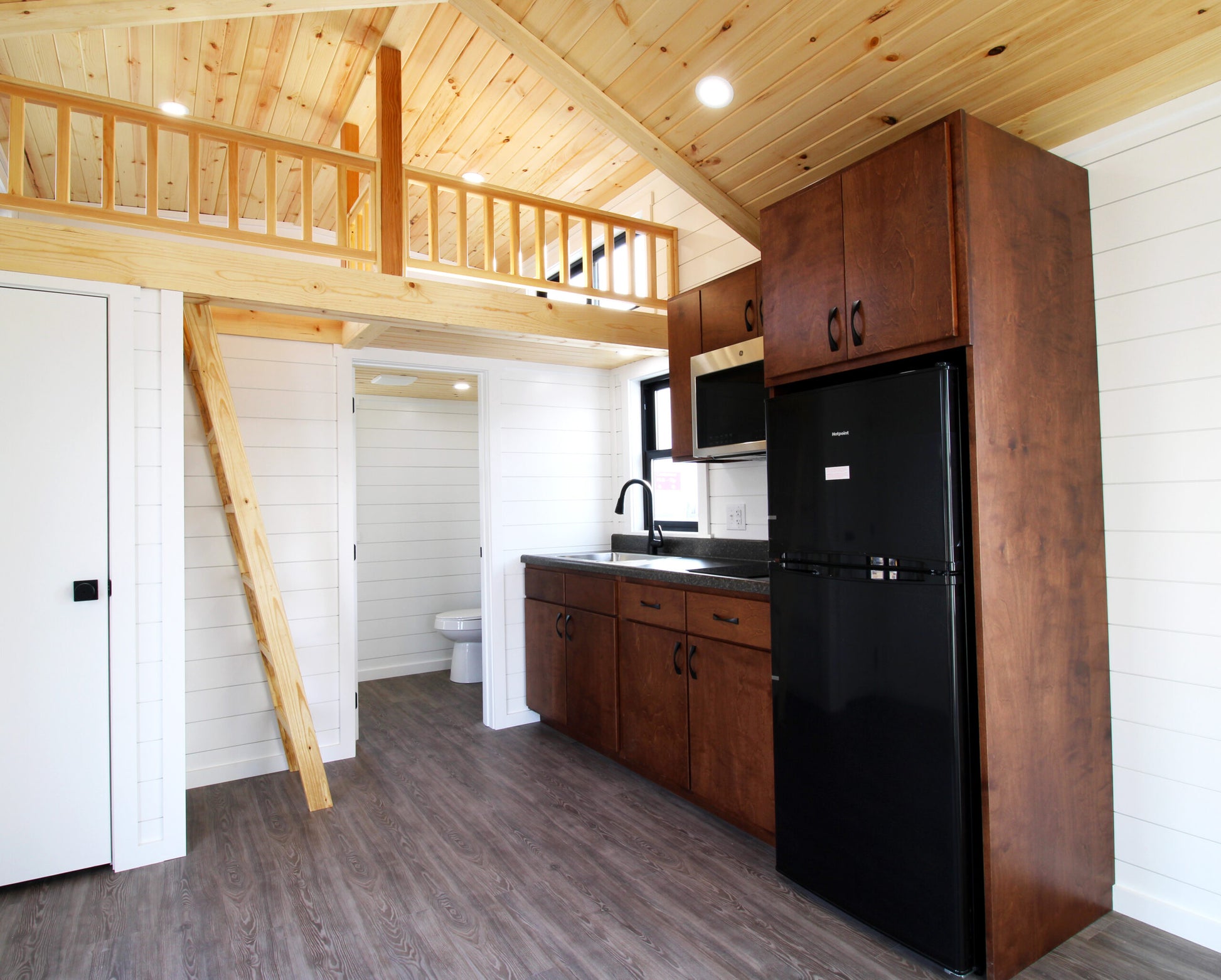 The Zorro RV Park Model features a sleek, contemporary design with a charming log exterior and a modern interior finished in white shiplap and clear pine. The combination of a main-floor bedroom and an additional loft maximizes comfort and functionality, making this an ideal choice for a cozy family retreat or an income-generating rental property.